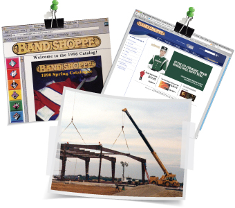 The early 1990s were a period of rapid growth. The company bought a building in Cynthiana to expand manufacturing and 10 acres of land just outside town. In September 1996, ground was broken on a new 27,500-square-foot office, warehouse, and manufacturing facility. The company opened Embroidery Direct to sell sports teams, cheer, and corporate apparel. The first e-commerce website launched for Band Shoppe. In 1998, Gerber CAD systems, a Gerber Cutter, and Barudan multi-head embroidery machines were added in major upgrades to manufacturing capabilities.