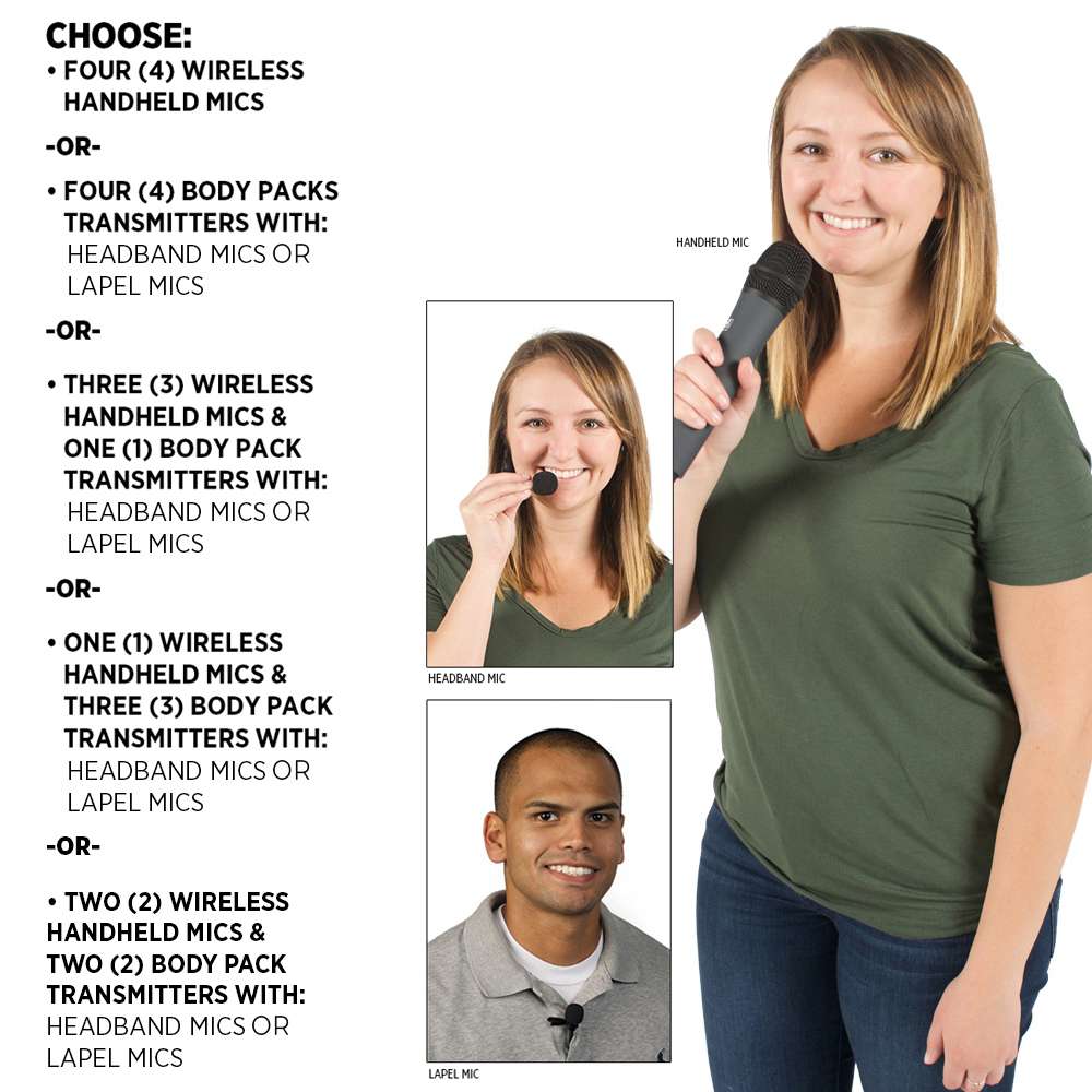 Package 4 Mic Options: pick four (4) – wireless handheld mic, belt pack with headband mic, or belt pack with lapel mic