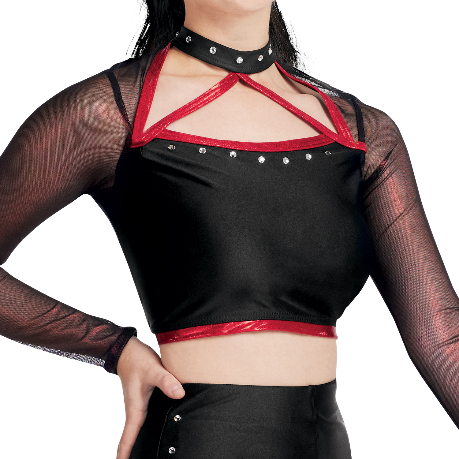 Long Sleeve Open Bodice Crop Top with a Mock Neck Collar and Rhinestones, Zippered Back Entry