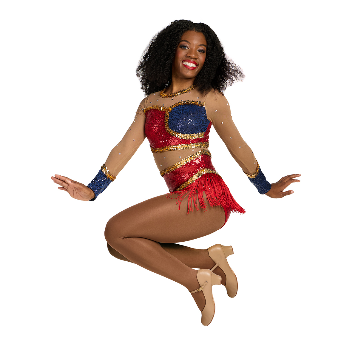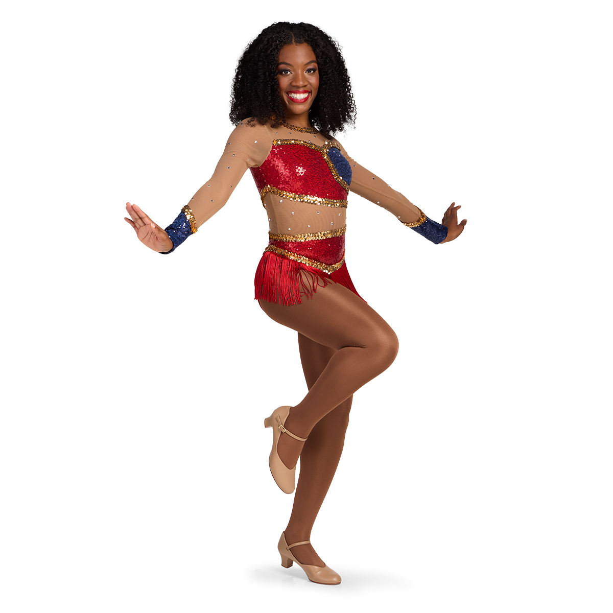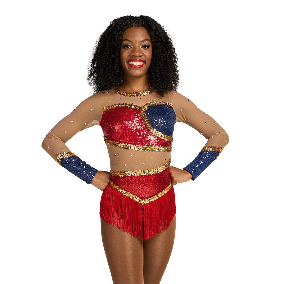 - Shown in: Red Holo Twinkle Twinkle, Navy Micro Sequin, Skintone Power Mesh with Rhinestones, Gold Sequin Trim, Red Fringe