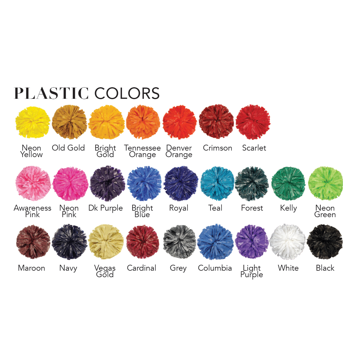 Plastic Colors: Awareness Pink, Black, Bright Blue, Bright Gold, Cardinal, Columbia, Crimson, Dark Purple, Denver Orange, Forest, Grey, Kelly, Light Purple, Maroon, Navy, Neon Green, Neon Pink, Neon Yellow, Old Gold, Royal, Scarlet, Teal, Tennessee Orange, Vegas Gold, White