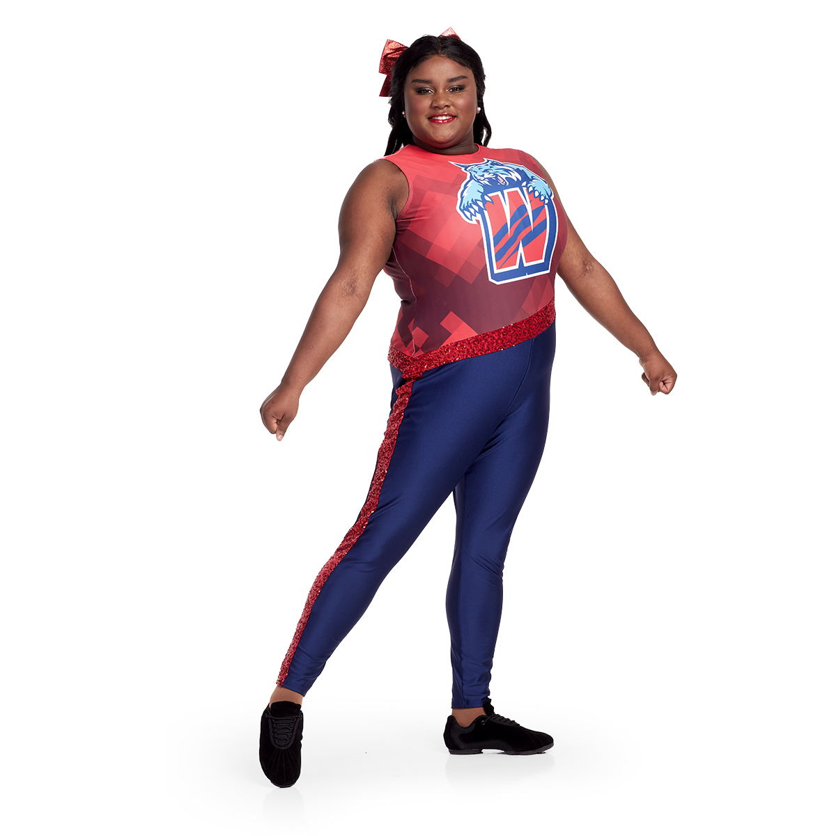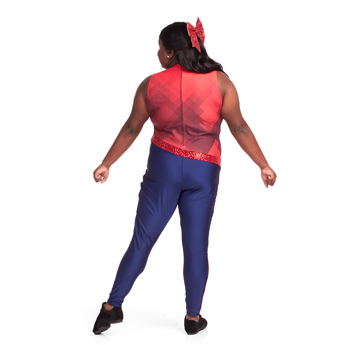 Move with confidence in the sleeveless legging unitard, perfect for dance teams, pom squads, and drill teams. Premium stretch fabrics provide flexibility, while the round neckline and zippered back ensure a secure fit. The Red Micro Sequin and Navy Satin Spandex add eye-catching shine, and the Digitally Printed bodice lets you showcase your school mascot or logo. Complete your team’s look with our line of stock cheer bows and stock cheer poms!