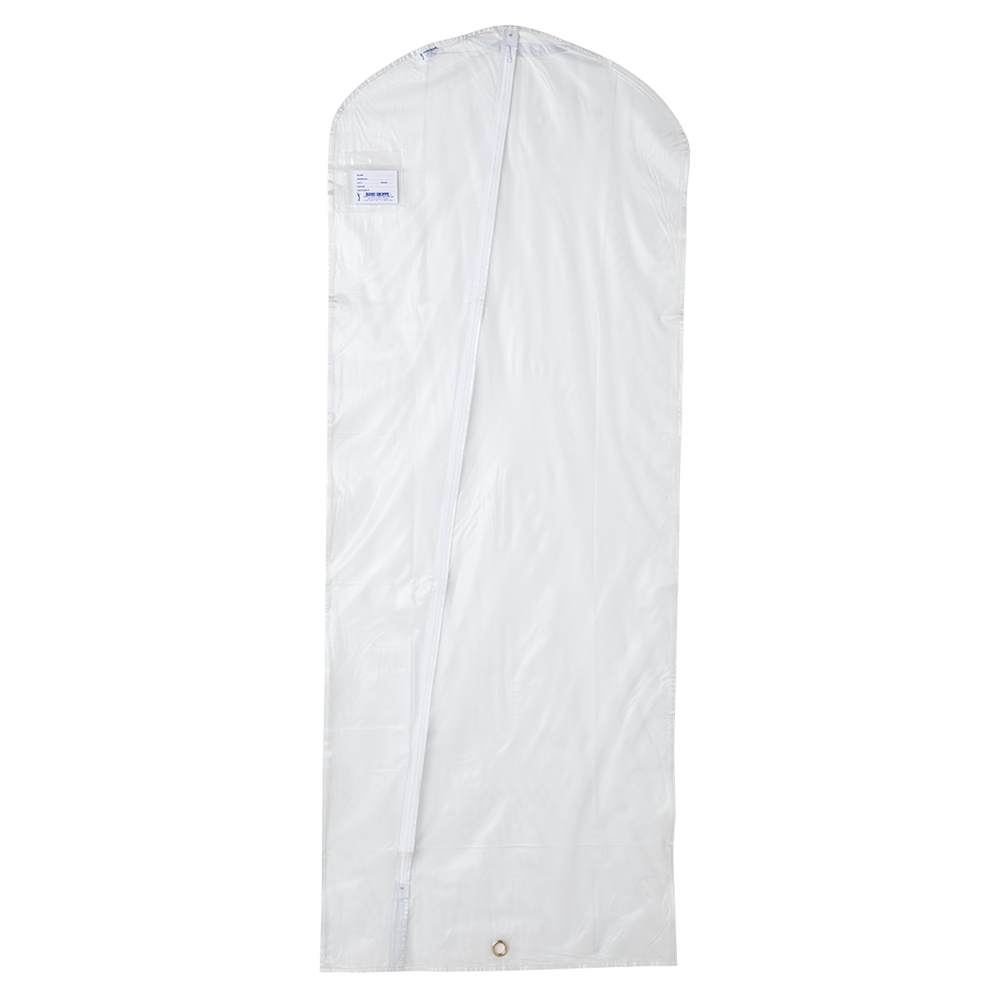long, clear vinyl garment bag, front view