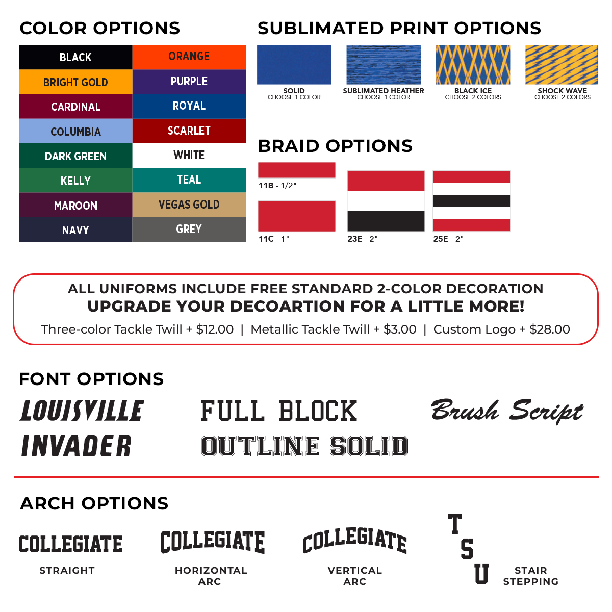 Includes free 2-color tackle twill with standard lettering. We cannot accept returns on custom uniforms. Minimum orders apply—see details below.