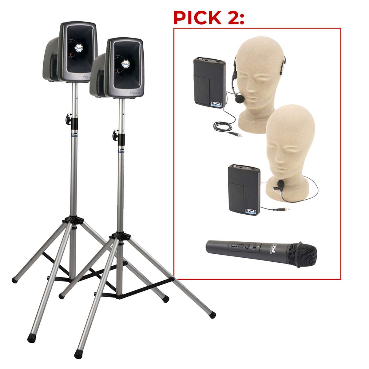 Package 2 Mic Options: pick two (2) – wireless handheld mic, belt pack with headband mic, or belt pack with lapel mic