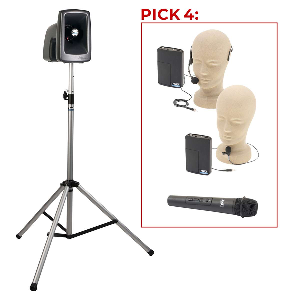 Package 4 Mic Options: pick four (4) – wireless handheld mic, belt pack with headband mic, or belt pack with lapel mic