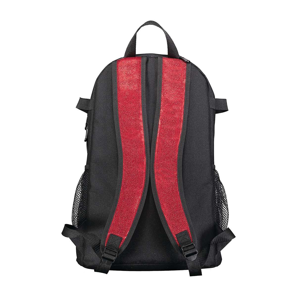 The All Out Glitter backpack from Augusta is the perfect cheerleading or dance apparel and other necessities whether you’re headed to school, practice, competitions, or the gym! Made from glitter polyurethane, a lightweight glitter material, this sturdy backpack’s four zippered compartments can hold everything you might need to keep handy. The large compartment is padded to comfortably fit a full size laptop, and a smaller front compartment features an interior shoe compartment. Plus the water bottle side compartments help you stray hydrated throughout those long days. Padded straps for added comfort so carrying heavy loads is less strenuous. Measures approximately 18-1/2″ × 12″ × 7″.