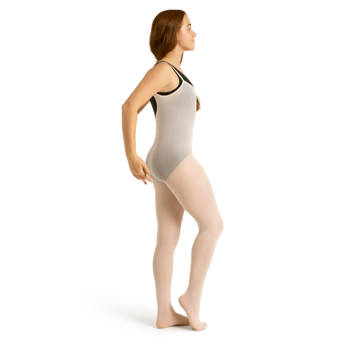 model wearing black capezio body tights, front three-quarters view