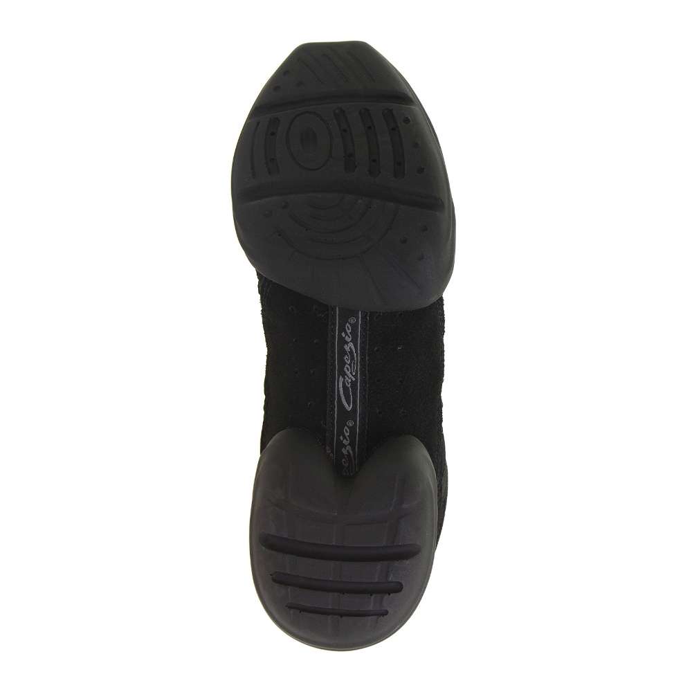 Sweat it out in the Capezio Rock It Dansneaker! Made with excellent durability and comfort with an elegant suede look, the Rock It is the fastest-growing shoe in the Dansneaker line. Featuring a stylish suede-like look, this shoe is the fastest-growing favorite in the Dansneaker line. The split-sole design ensures maximum flexibility and allows for full foot articulation, making every move smoother and more controlled. Built-in flex points and a forepart spin spot allow for easy turns, while the ventilated arch adds an extra level of comfort and flexibility. Whether you’re performing indoors or outdoors, the non-marking PU outsole provides excellent grip and durability. With a snug, secure fit thanks to the speed-looped lacing system, plus a padded tongue, collar, and cushioned Achilles notch for added comfort, the Rock It Dansneaker is perfect for long rehearsals and performances.