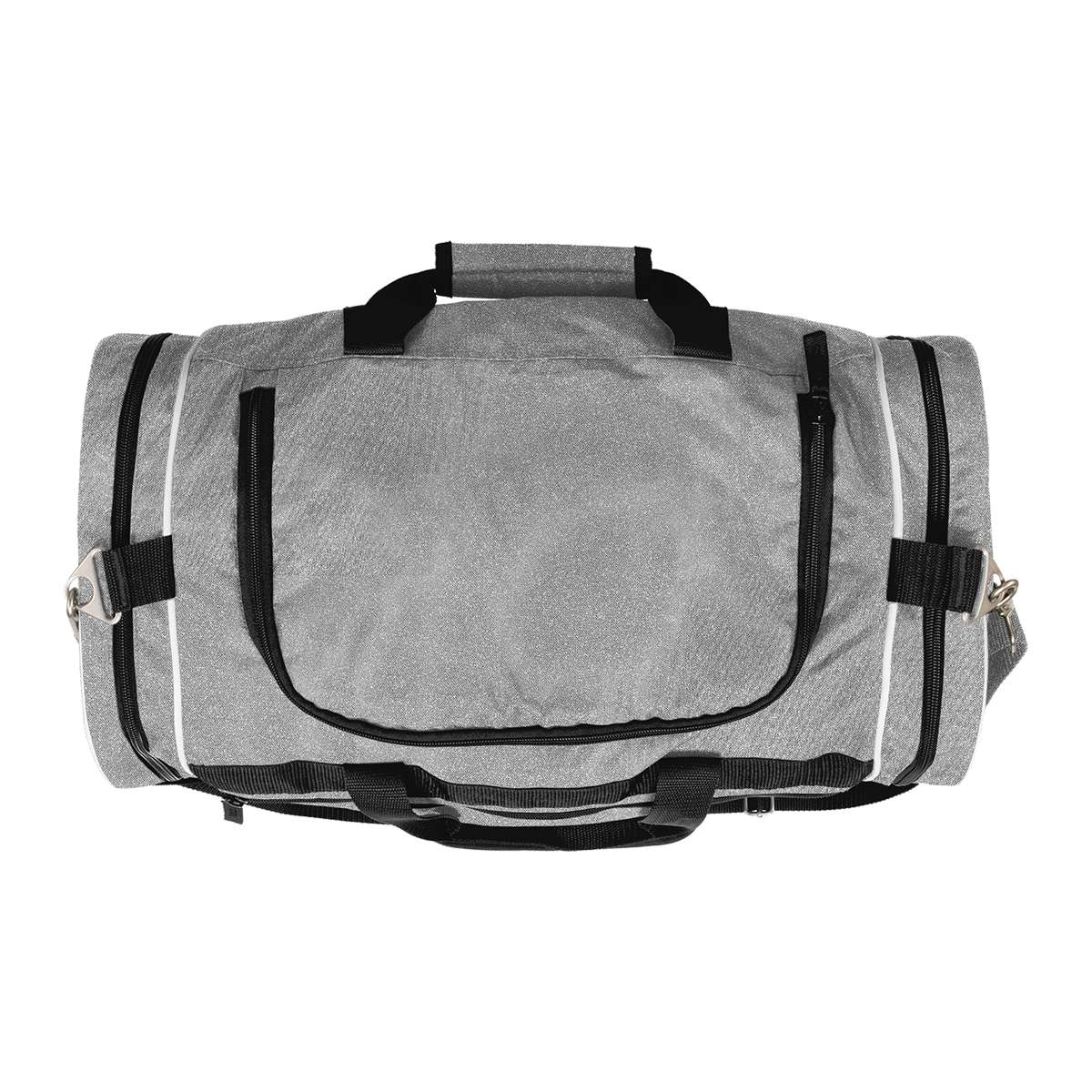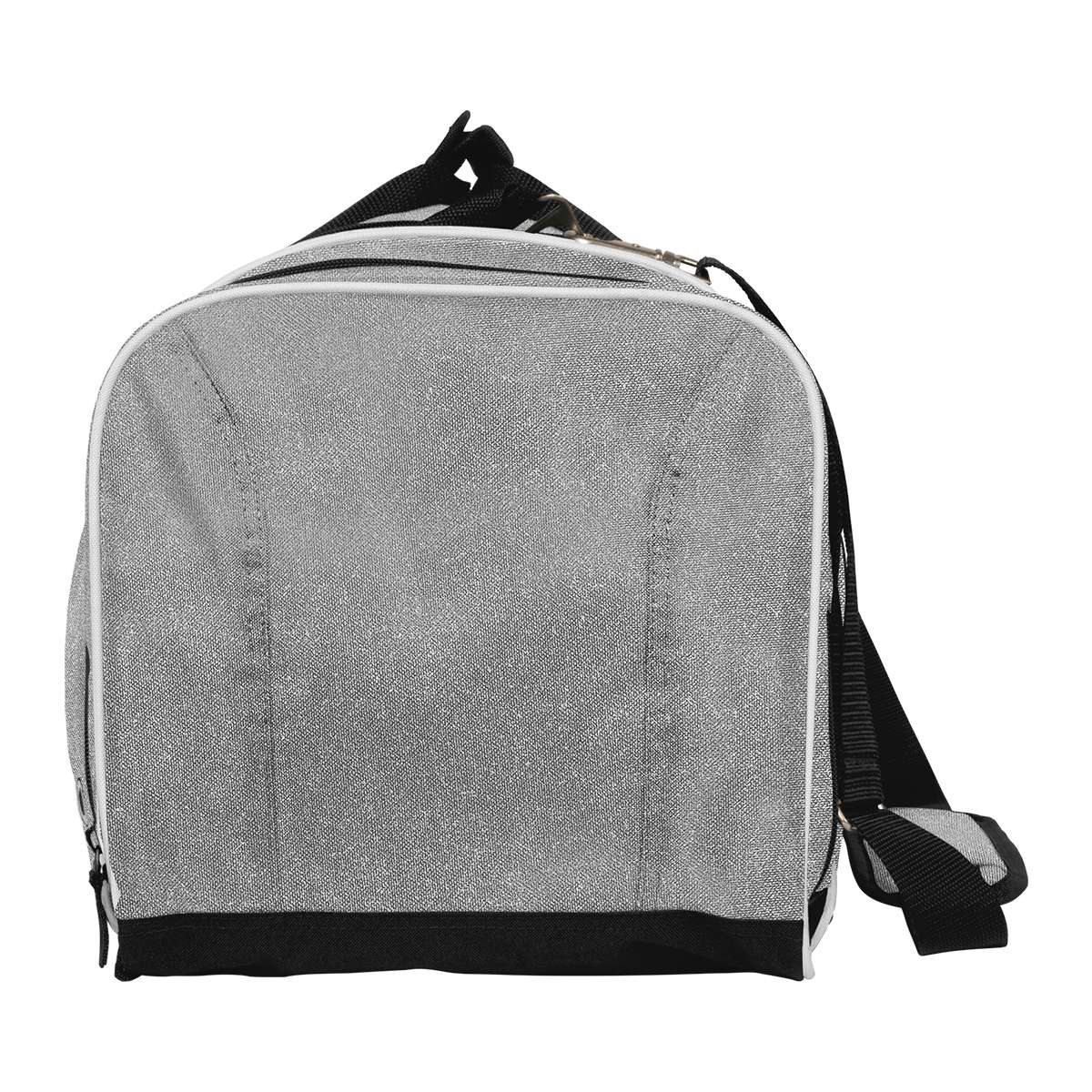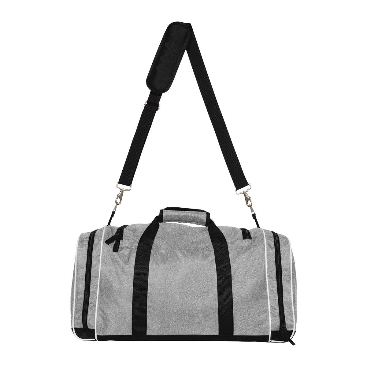 The All-Around Glitter Duffle Bag from Champion is perfect for carrying all of the necessities with a fun glitter shine! This durable, travel-ready design measures 21-3/4″ long × 10-3/4″ wide × 11-3/4″ tall, perfect for school, competitions, warmups, and on the road. Features a large u-shaped compartment, a front pocket with mesh organizer, zippered side pockets with a jock tag on one end, detachable and adjustable padded shoulder strap, and heavy duty metal hardware to ensure your duffle bag lasts the entire school year.