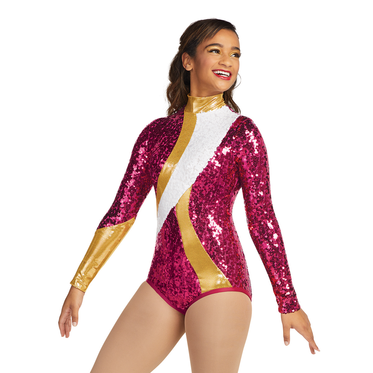 Shown in: Maroon and White Drumroll Sequin, Maroon Matte Spandex, Gold Mystic Jewels