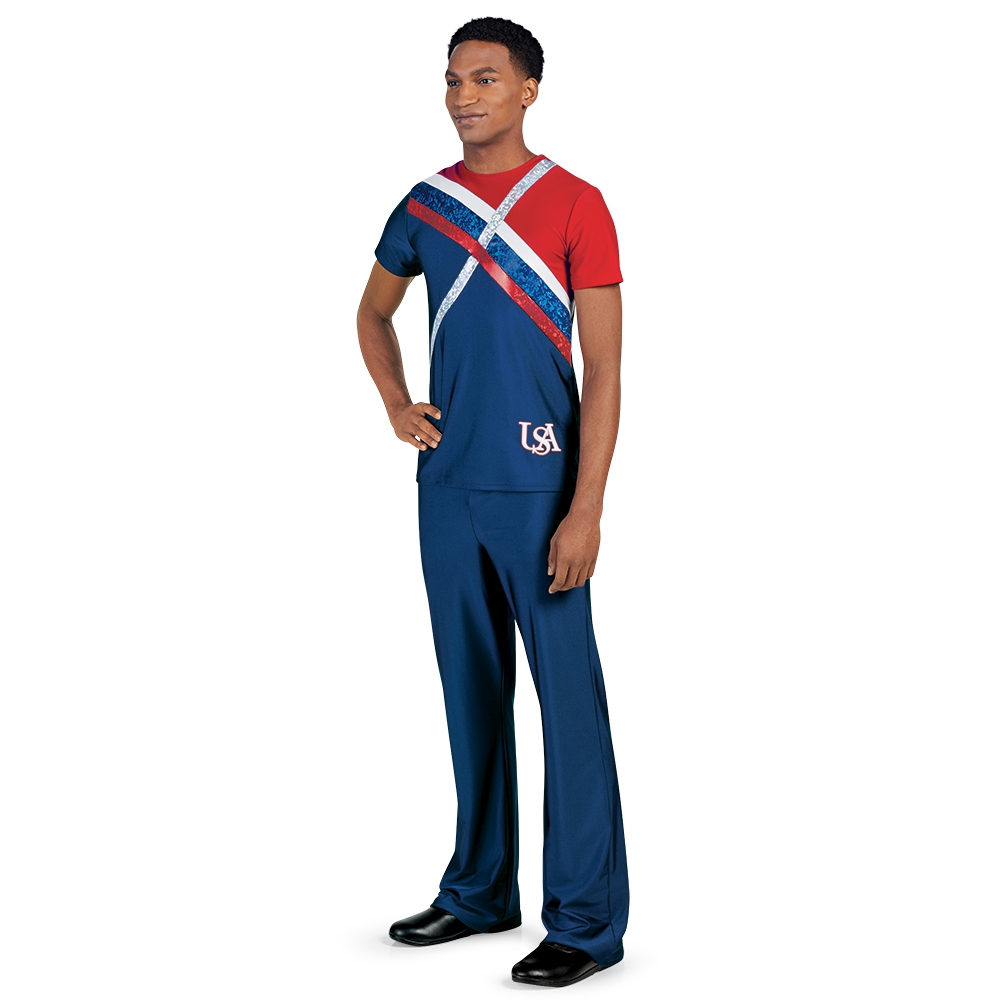 Make a statement in this Men’s short sleeve tunic, designed for dance teams, pom squads, and performance groups. Featuring curved stripes and a pull-on entry, it offers a sleek, comfortable fit. Stretch fabrics with shimmering metallics add bold sparkle, making it perfect for game day, competitions, and halftime performances. Make it uniquely yours with included front decoration!