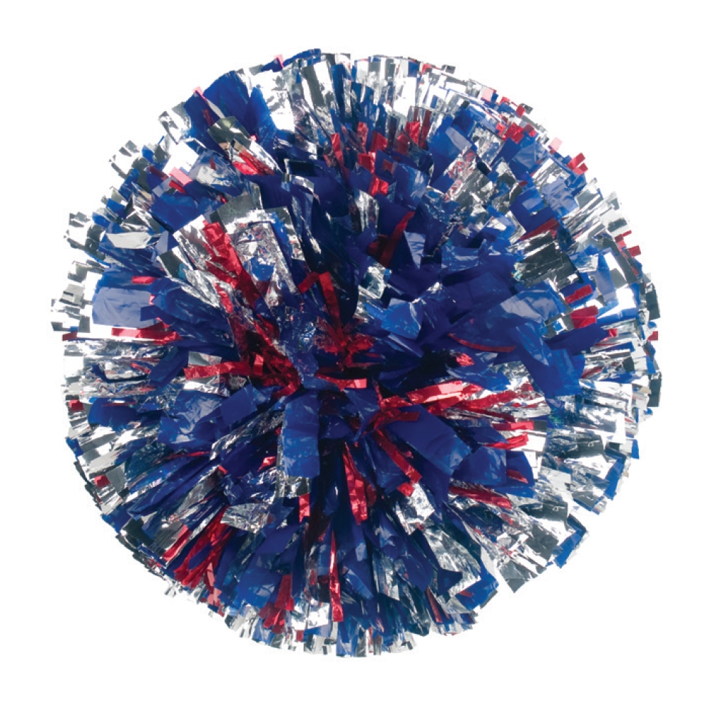 Pom as shown: Royal 3/4″ wide Plastic strands, Silver 3/4″ wide Metallic strands, Red 3/16″ wide Glitter strands