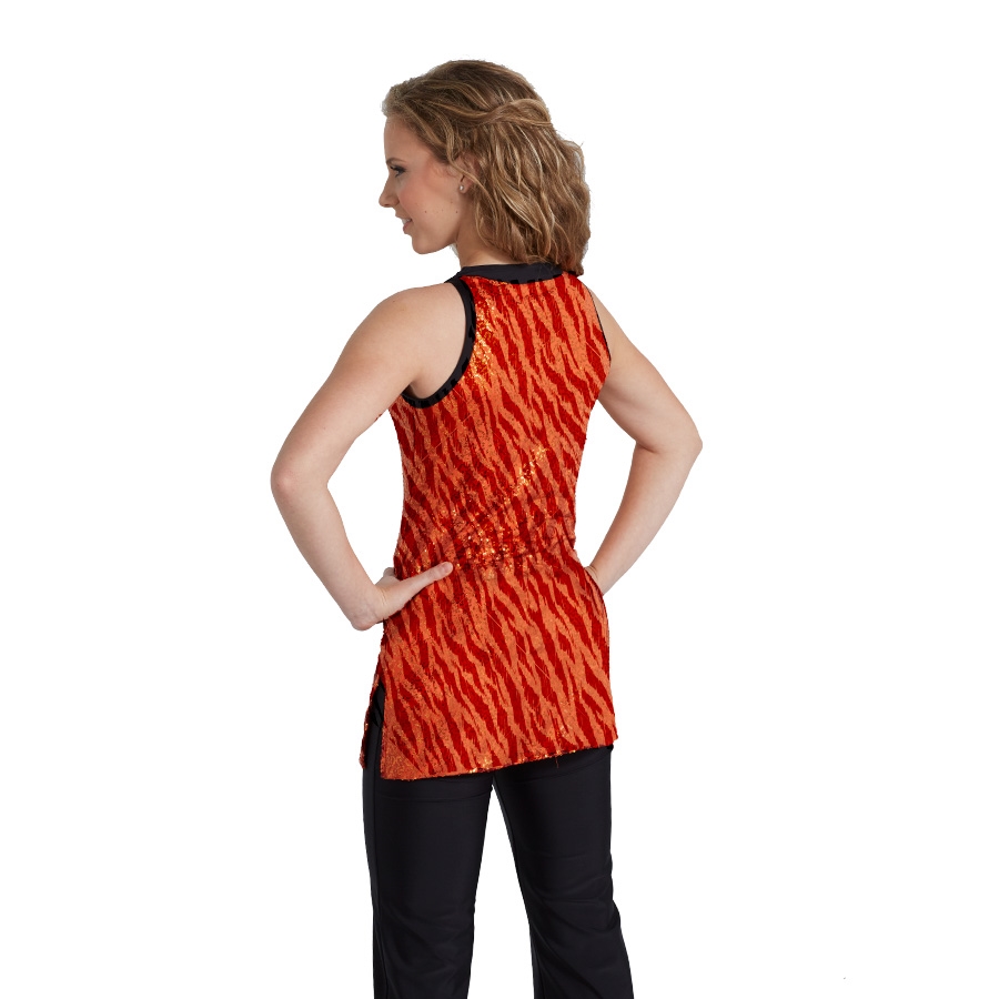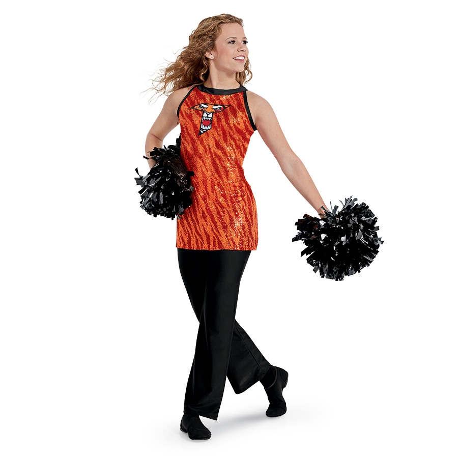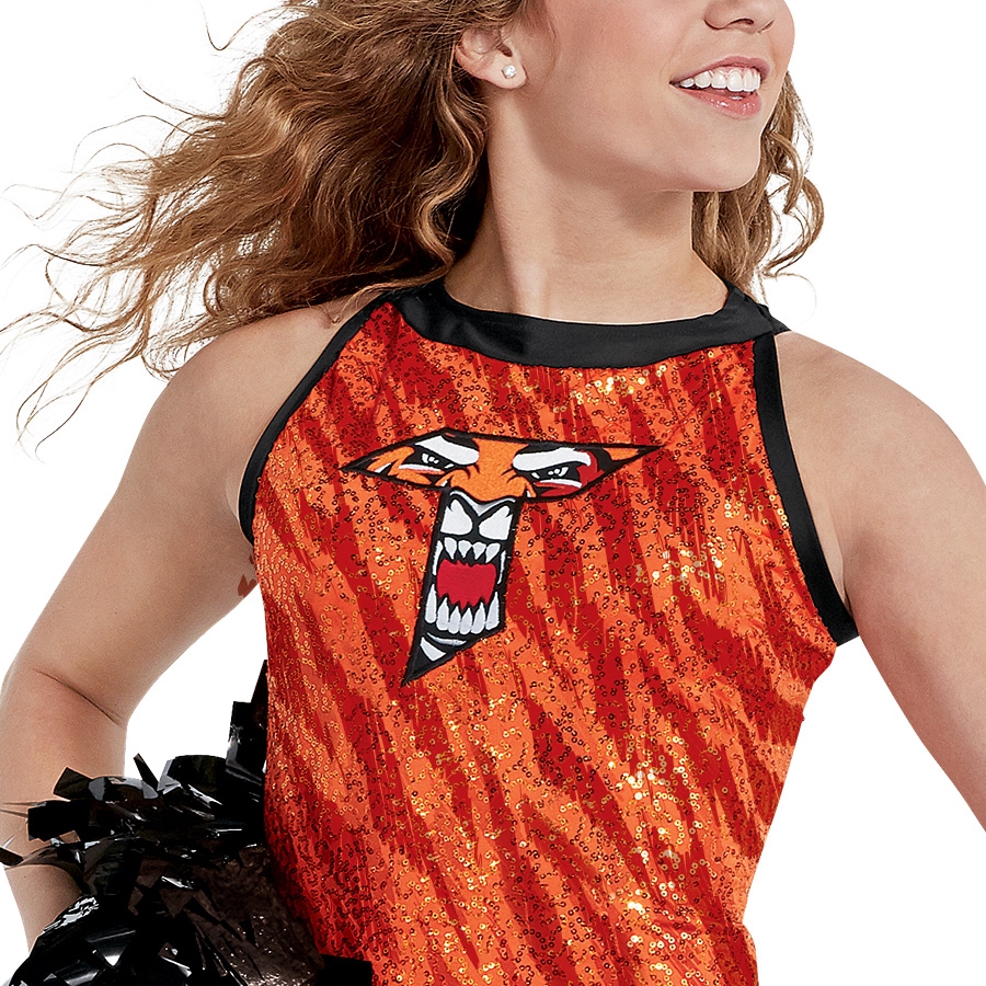 Step into the spotlight with this A-line tunic, designed for movement and style! The round neckline and side slits create a sleek, performance-ready fit, while stretch fabrics with shimmering sequins add eye-catching sparkle. A solid back and pull-on entry ensure comfort and ease, perfect for dance, pom, and performance teams. Plus, the included front decoration lets your group stand out with custom details. Pair it with our stock cheer bows and stock poms for a complete game-day look.