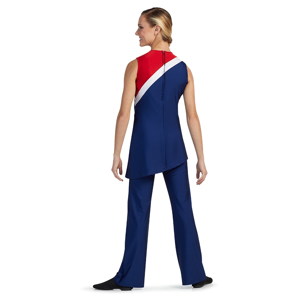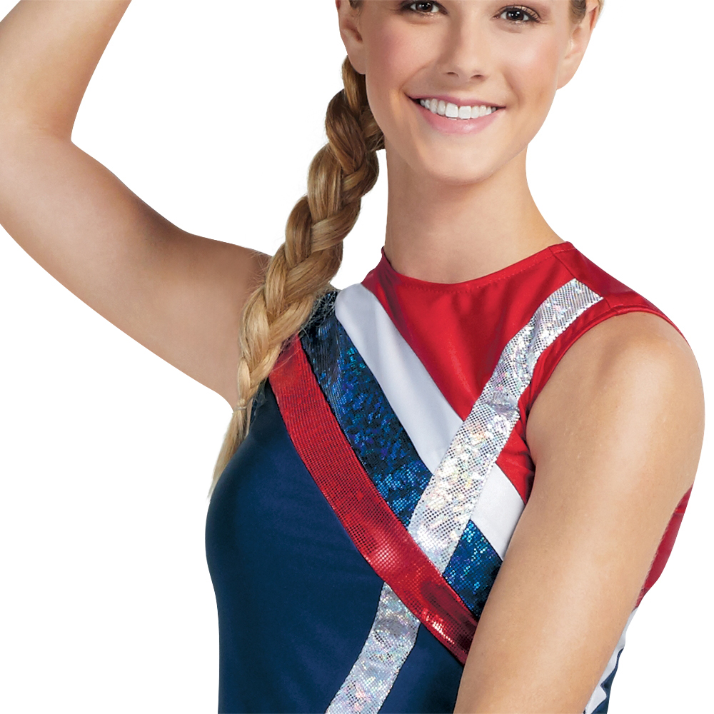 Make a statement in this asymmetric sleeveless tunic, designed for dance teams, pom squads, and performance groups. Featuring curved stripes and a zipper back entry, it offers a sleek, comfortable fit. Stretch fabrics with shimmering metallics add bold sparkle, making it perfect for game day, competitions, and halftime performances. Make it uniquely yours with added decoration for a little more!