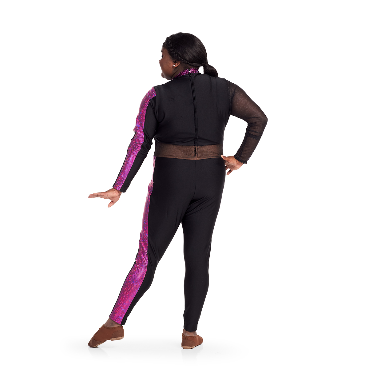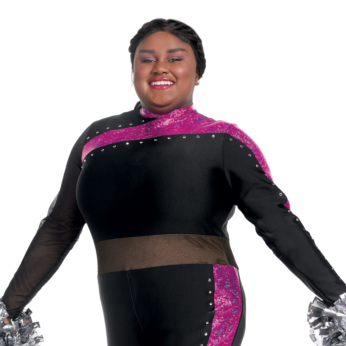 Stand out in the Long Sleeve Legging Unitard, designed for bold performances! The mock turtleneck and faux midriff panel create a sleek, modern look, while rhinestones on the left leg add eye-catching sparkle. Stretch fabrics with shimmer metallic accents move with you, ensuring comfort and flexibility. A zippered back allows for easy entry. Finish your team’s look with our line of stock cheer poms!