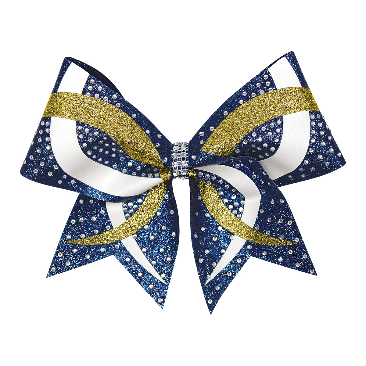 Bow as shown: Navy and Gold Glitter Novelty Fabric with Solid White Ribbon and Silver Rhinestones