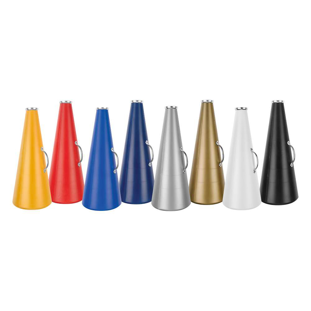 The original Plastic Molded Megaphone, preferred by schools and colleges since 1970! Individually molded featuring a classic wide bottom shape with a rolled edge for added strength. Includes steel handle and aluminum mouthpiece, choose from eight popular team colors and four sizes.