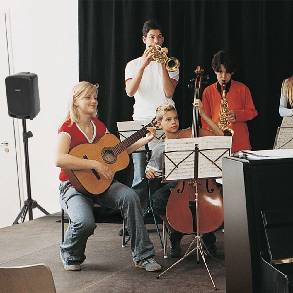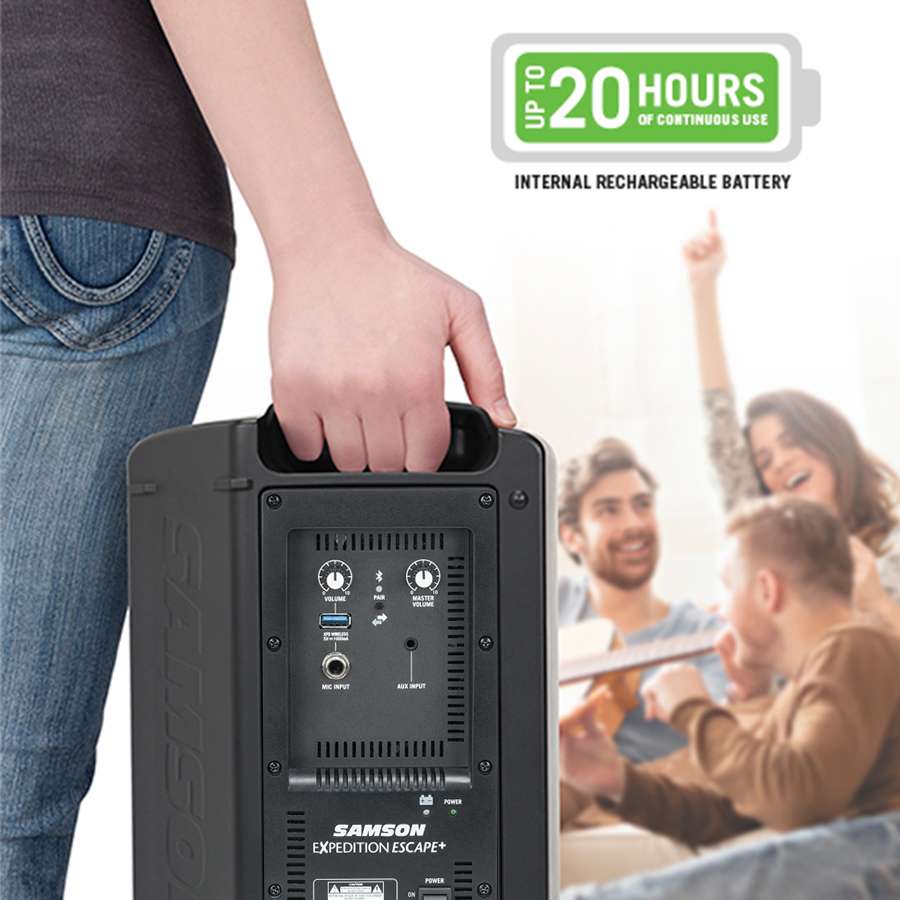 The Samson Expedition Escape+ offers powerful sound in a compact, lightweight design. Weighing under 10.5 pounds, this wireless, rechargeable speaker is easy to carry with one hand while delivering robust audio for rooms of up to 50 people. Enjoy up to 20 hours of continuous music streaming from any Bluetooth device, perfect for band camps, practices, parties, events, and more.